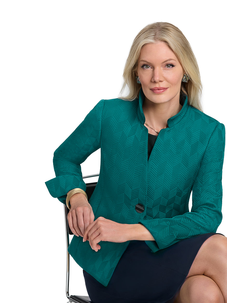 Crafted from an all-cotton chevron weave with subtle sheen, this polished jacket brings texture and refinement to everyday dressing. The clean, structured silhouette features a single-button closure for a modern, professional finish. Perfect with a sleek tee or layered over knits. The fabric’s sleek, symmetrical pattern adds a sophisticated and modern edge to the overall look.